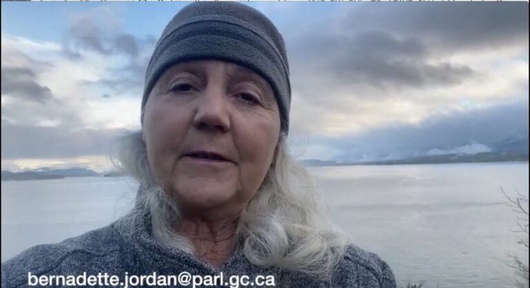 (Screen shot of a YouTube video message by Alexandra Morton to Fisheries Minister Bernadette Jordan)