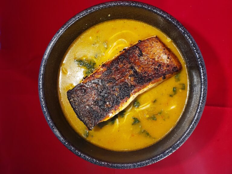 We are not able to get fresh coconuts and whole spices as easily as one would when in Penang, but we can improvise. Here is my version using ingredients easily available, and in-season sustainable B.C. farmed salmon.